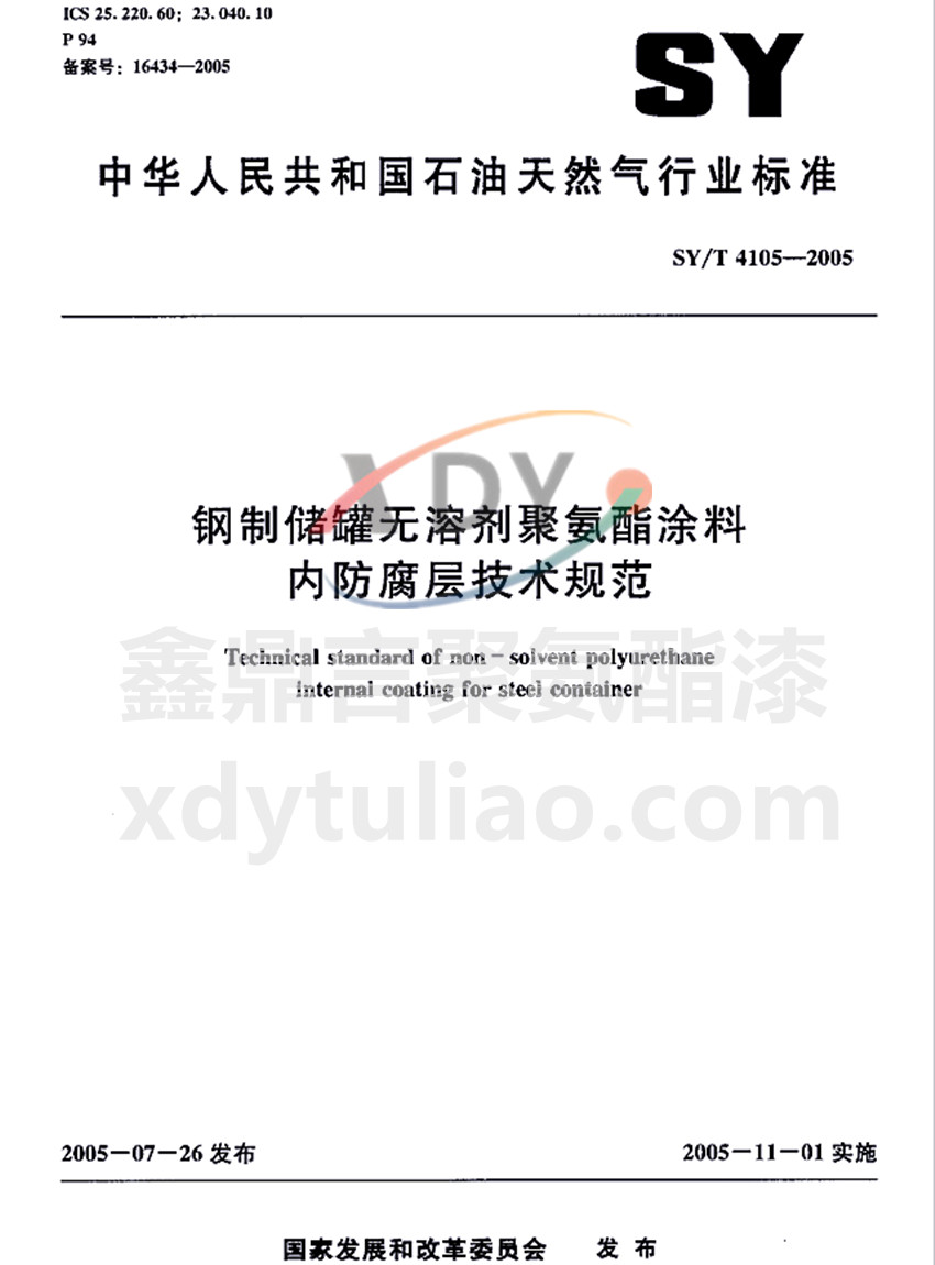 SY/T 4105-2005鋼制儲(chǔ)罐無(wú)溶劑聚氨酯涂料內(nèi)防腐層技術(shù)規(guī)范 ICS 25.220.60;23.040.10 P 94 備案號(hào):16434-2005 SY 中華人民共和國(guó)石油天然氣行業(yè)標(biāo)準(zhǔn) SY/T 4105-2005 鋼制儲(chǔ)罐無(wú)溶劑聚氨酯涂料內(nèi)防腐層技術(shù)規(guī)范Technical standard of non-solvent polyurethane internal coatings f