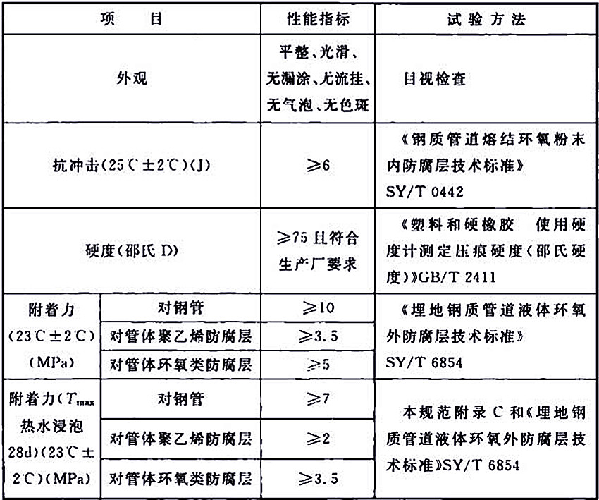 4.3 補(bǔ)口防腐層質(zhì)量檢驗(yàn)應(yīng)包括外觀、厚度、硬度、漏點(diǎn)和附著力,并應(yīng)符合下列規(guī)定: