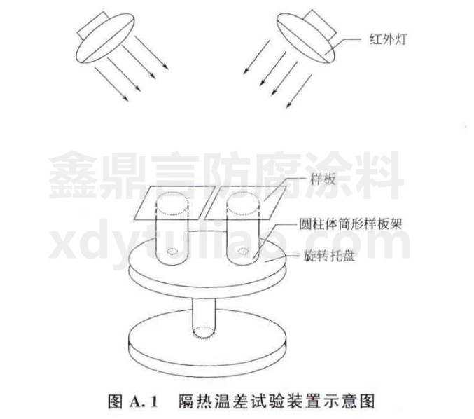 A.3.2、試驗(yàn)在18℃—27℃的環(huán)境條件下進(jìn)行。在旋轉(zhuǎn)托盤(pán)上放置圓柱體筒形樣板架,圓柱體筒形樣板架的中心應(yīng)對(duì)準(zhǔn)托盤(pán)上圓孔的中心;將1塊試板及1塊空白試板放在圓柱體筒形樣板架上,兩塊板之間間隔5mm,試板有涂層的面向上,空白試板經(jīng)過(guò)噴砂或拋丸的面向上;在旋轉(zhuǎn)托盤(pán)的上方0.5m處,安裝2只紅外燈,紅外燈與旋轉(zhuǎn)托盤(pán)邊緣的水平距離為15cm,紅外燈的加熱面軸向與試板平面成75°。