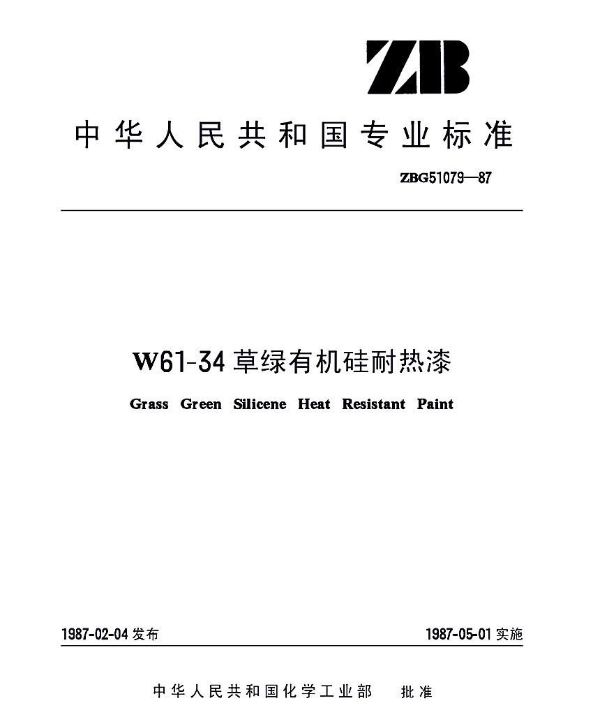 HG/T 3361-1987 W61-34草綠有機(jī)硅耐熱漆標(biāo)準(zhǔn)ZBG51079-87(代替HG 2-637-74) ZB 中華人民共和國(guó)專(zhuān)業(yè)標(biāo)準(zhǔn) ZBG51079-87 W61-34草綠有機(jī)硅耐熱漆Grass Green Silicene Heat Resistant Paint 1987-02-04發(fā)布,1987-05-01實(shí)施 中華人民共和國(guó)化學(xué)工業(yè)部 批準(zhǔn) ZBG51079-87代替HG 2